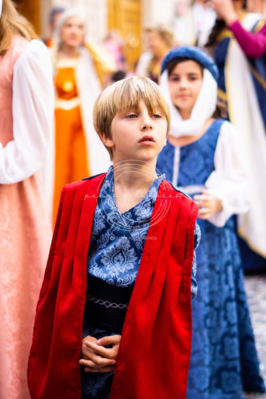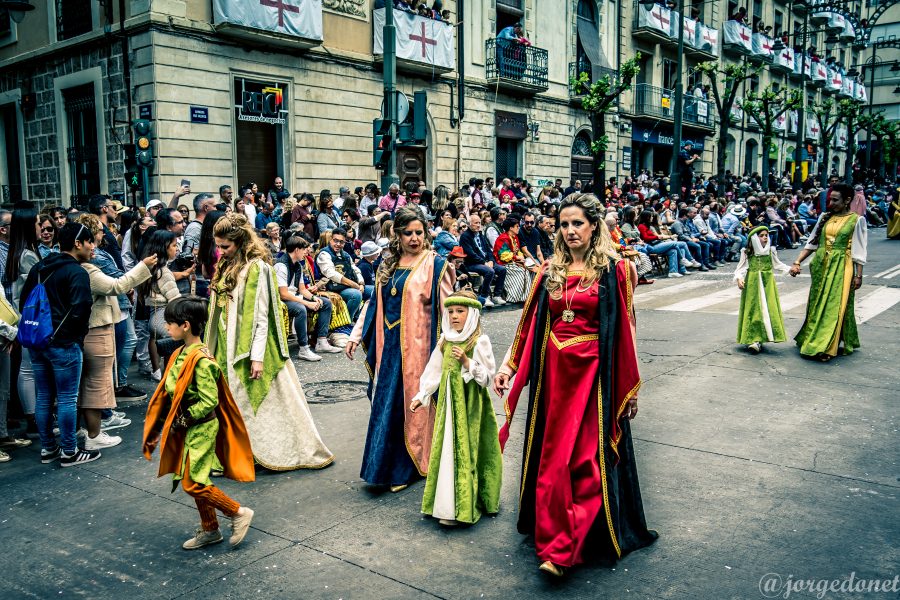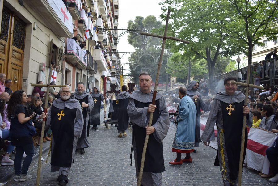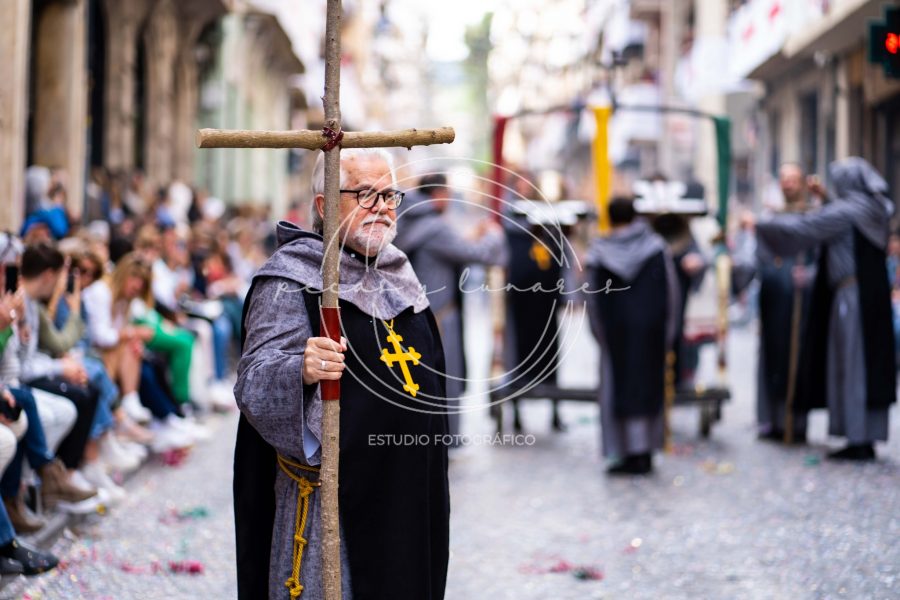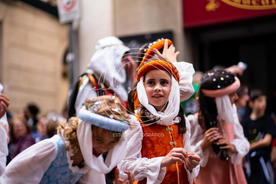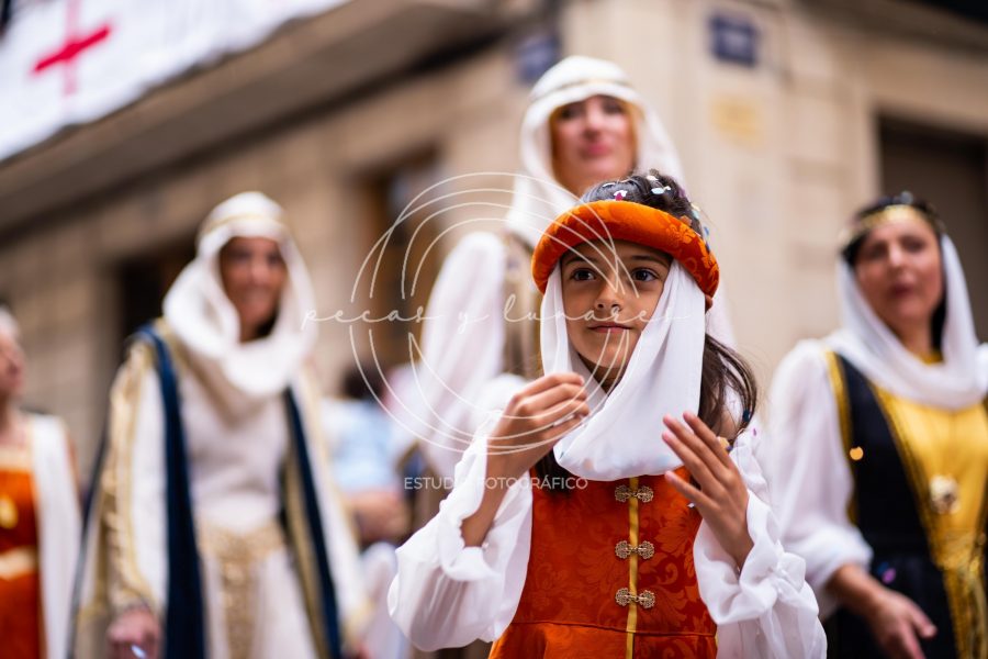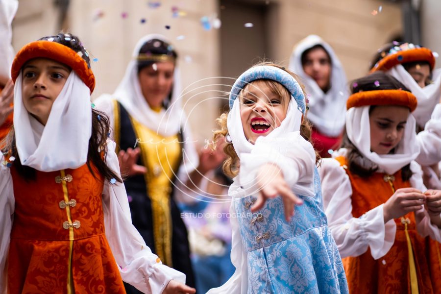 Ballet de chicos representando el bando moro y el bando cristiano, donde se combina el baile y la lucha con diferentes armas y grandes banderas.